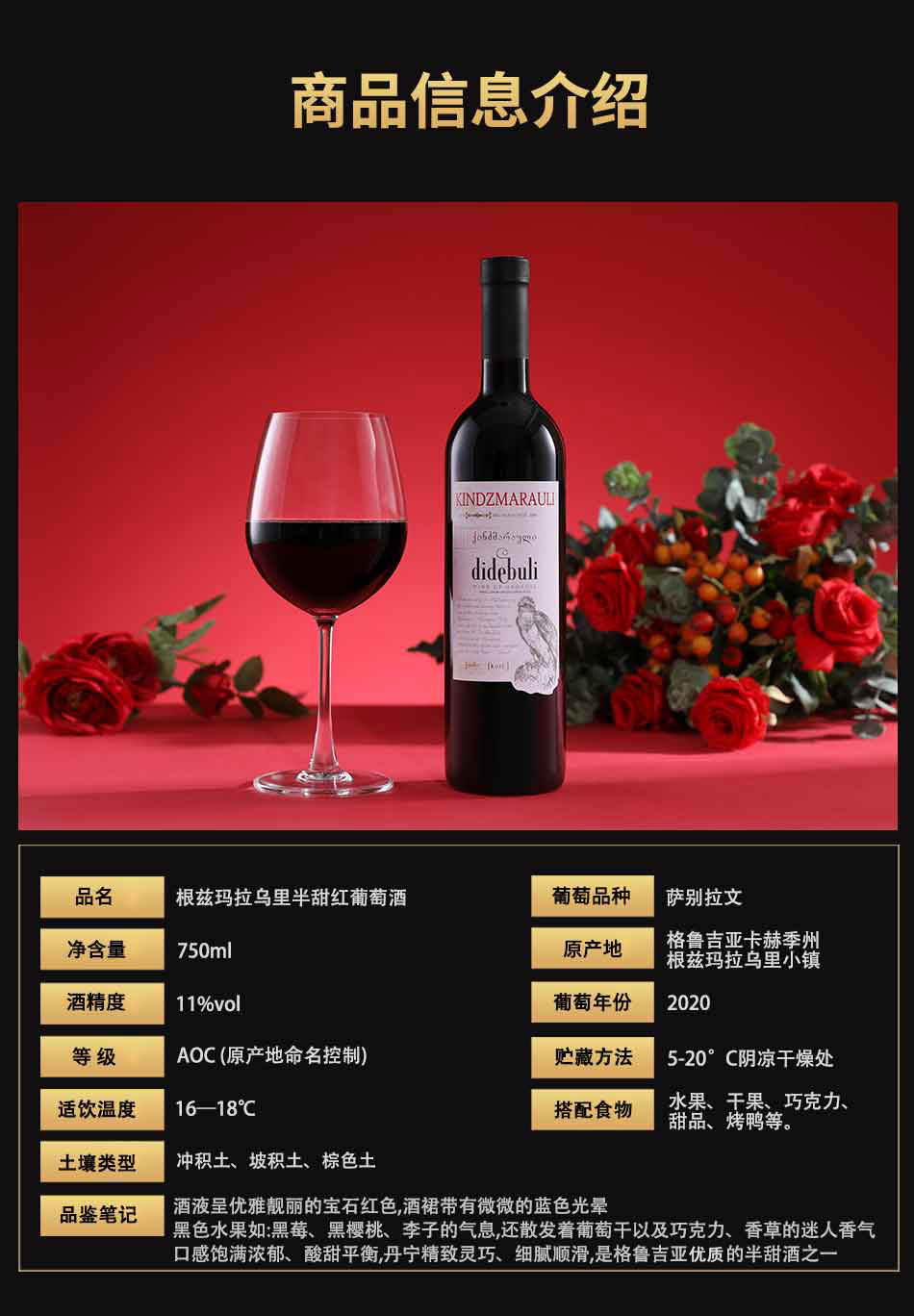 品鉴笔记:酒液呈优雅靓丽的宝石红色,酒裙带有微微的蓝色光晕。黑色水果如:黑莓、黑樱桃、李子的气息,还散发着葡萄干以及巧克力、香草的迷人香气。口感饱满浓郁、酸甜平衡,丹宁精致灵巧、细腻顺滑,是格鲁吉亚顶级的半甜酒之一。